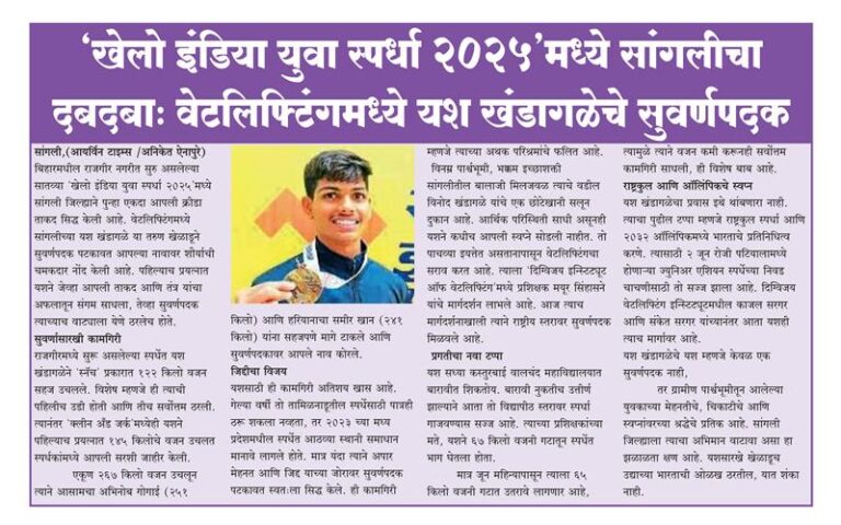 Unparalleled Performance: वेटलिफ्टिंगमध्ये यश खंडागळेचे सुवर्णपदक: ‘खेलो इंडिया युवा स्पर्धा 2025’मध्ये सांगलीचा दबदबा